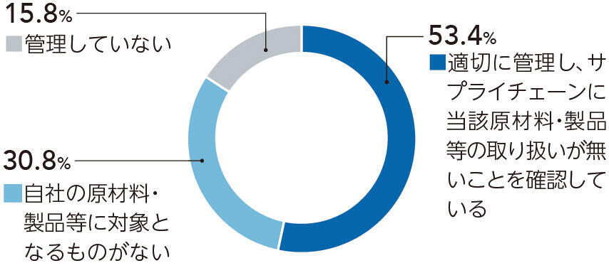 前年度に引き続き、2024年度もウイグル人権防止法や対中国に関するリスク対応についてのアンケート設問を設けました。「社会的・国際的に、深刻な人権侵害が懸念される国および地域を把握し、適切な管理」の有無を問う設問に対し、「適切に管理している」と回答したサプライヤーは約50%でした。今年度は回答選択肢を見直し、「管理していない」と「自社の原材料・製品等に対象となるものがない」に分けて設問した結果、単純に管理体制が未整備であるサプライヤーは約15%であることが明確になりました。