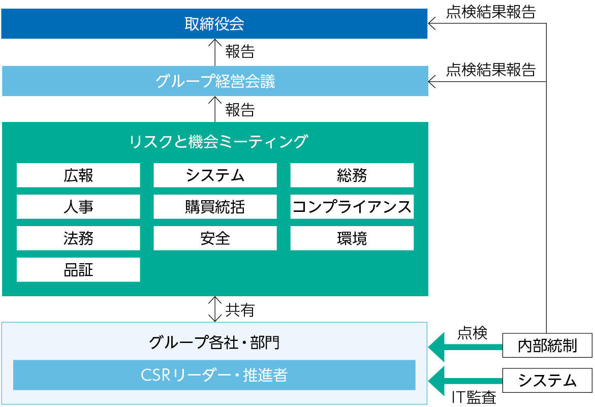 グループ各社のリスク管理状況は品質監査、環境監査、労務監査、IT監査などのリスク管理部門が行う監査によってモニターし、その状況はリスク管理部門から、個別課題状況または全般状況としてリスクと機会ミーティングで報告、情報共有がなされ、当社グループ経営会議、その後取締役会へ年2回報告を行っています。
