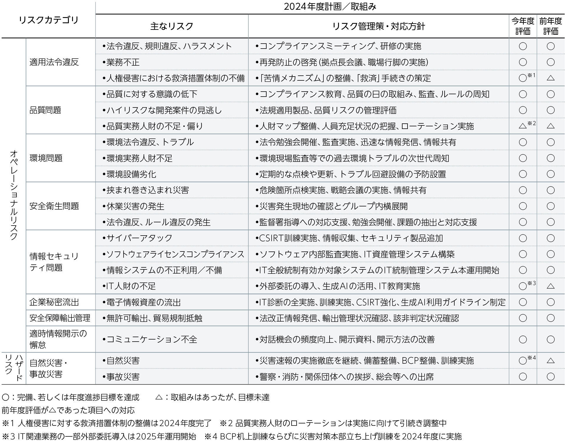 グループリスク管理規則において規定されるリスクのうち、オペレーショナルリスク並びにハザードリスクの主なリスクと、対応実績評価は以下の通りとなります。