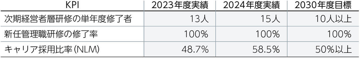 2024年度の次期経営者層研修の修了者は15名、新任管理職研修の修了率は100%となり、いずれも目標を達成しました。