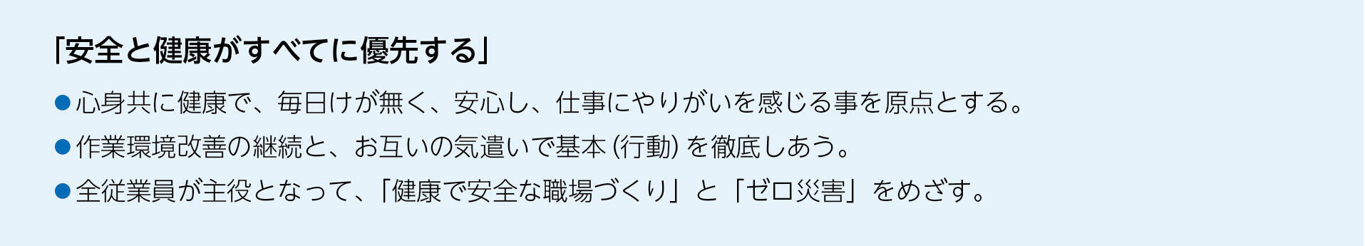 グループ安全衛生方針は、「グループ経営方針」の基本方針である「健康で安全な職場をつくり、『ゼロ災害』を達成する」に基づき次のように策定しています。