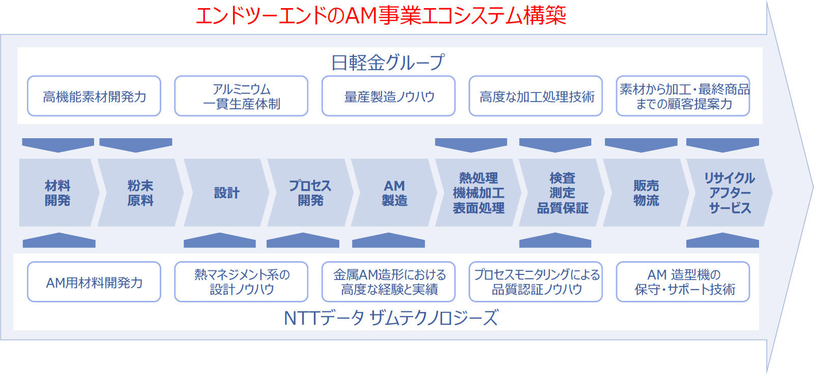 今回、当社が保有するアルミニウム合金開発や粉末製造・高度な加工処理技術および製造技術などの強みと、NTTデータ ザムテクノロジーズの持つ強みを融合し、成長著しい金属AM事業において、更なる顧客価値実現に繋がる商品やサービスを提供することを目的として、戦略的パートナーシップ契約を締結し、エンドツーエンドで提供することが出来る『オールインワンパートナー』としてお客様の事業拡大を支援してまいります。