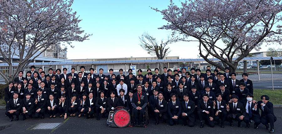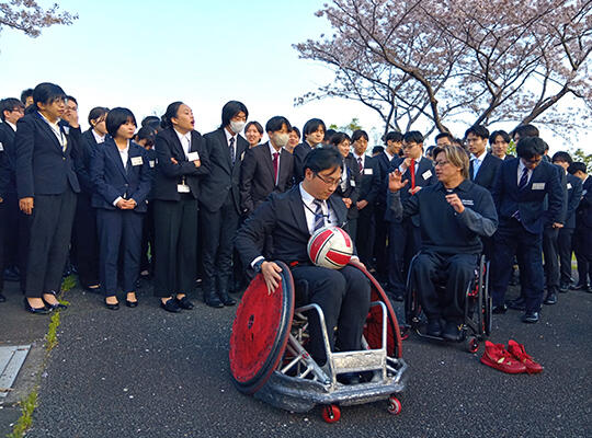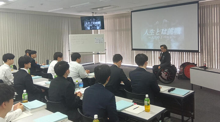 4月8日の研修では、多様な価値観を尊重し、新しい価値を創造できる人財にという想いから、車いすラグビー選手の池崎大輔氏をお招きし、手作り資料による講演と激励の言葉をいただきました。
