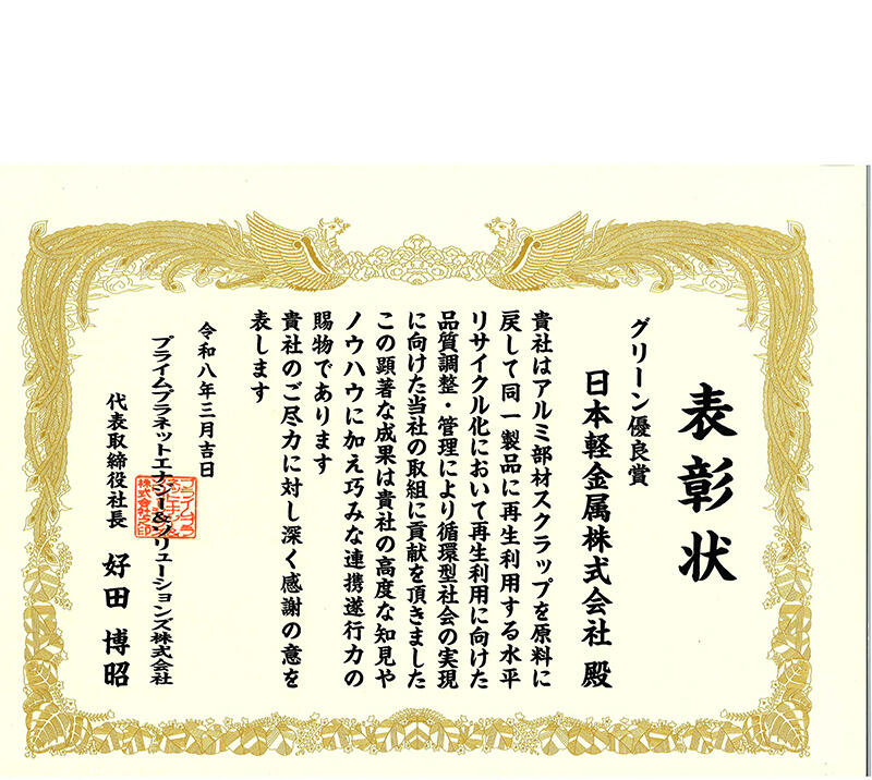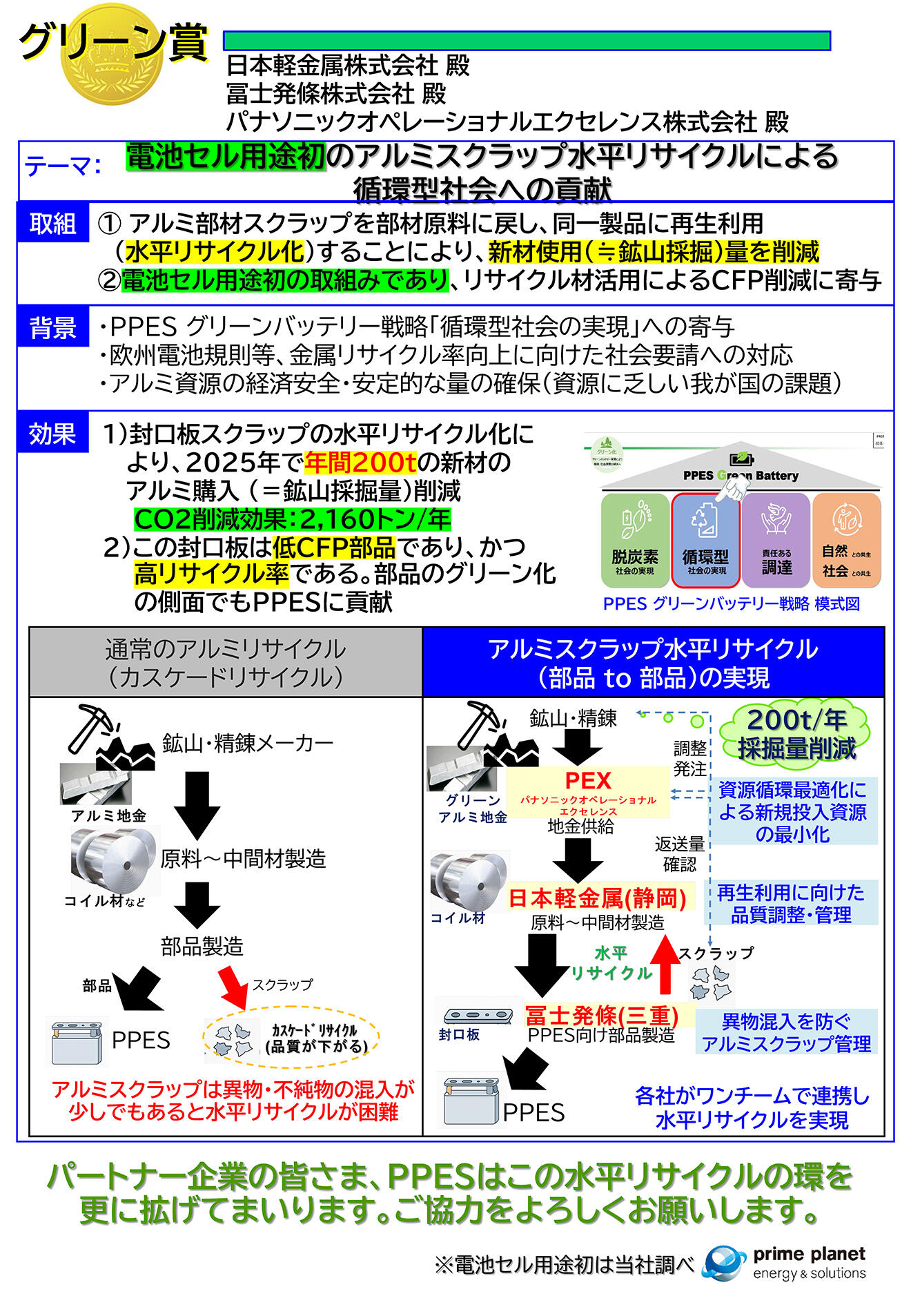 日本軽金属株式会社(代表取締役社長:朝来野修一、本社:東京都港区、以下:当社)は、プライムプラネットエナジー&ソリューションズ株式会社様(以下:PPES社)が3月12日に開催した「2026 PPES Partners Convention」において、循環型社会の実現に寄与したサプライヤーに与えられる「グリーン優良賞」を受賞しました。
